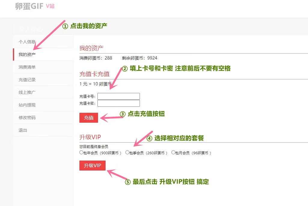 最后 得到卡密后,如上图充值卡密填上即可,然后点击充值按钮,这时会看到我的资产的卵蛋币有余额了 ,然后选择包季会员,点击升级VIP 完成!
